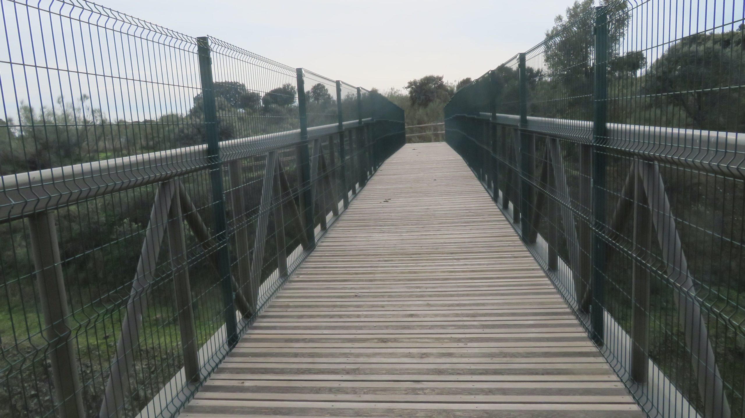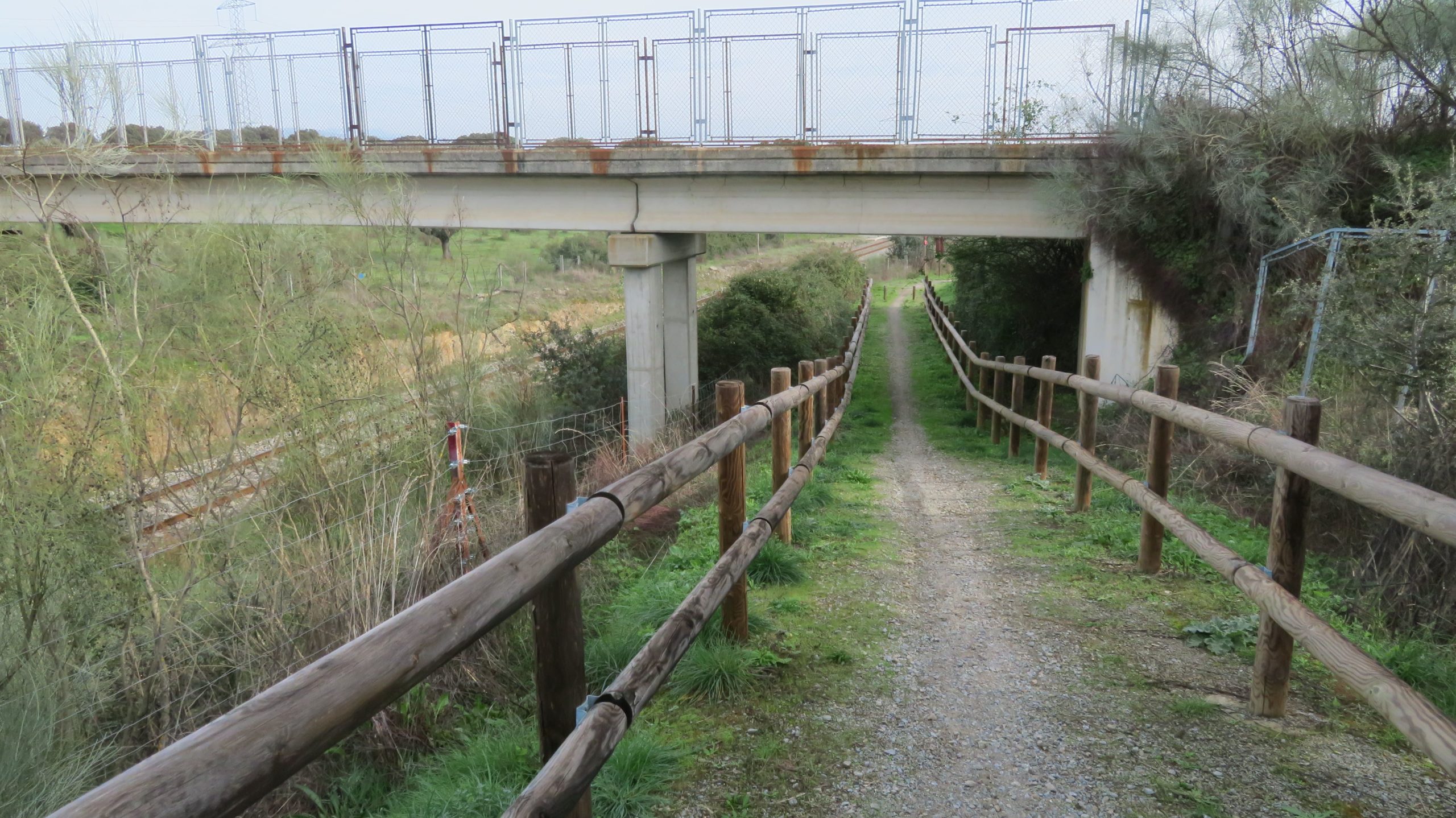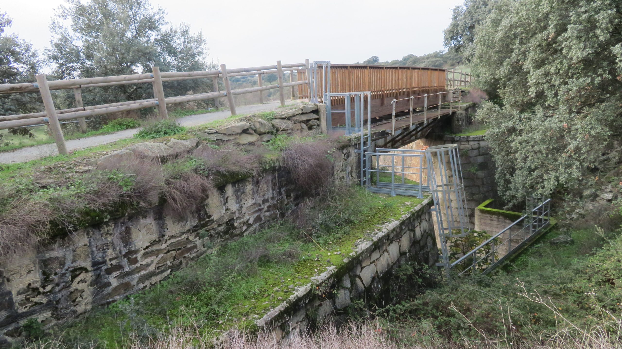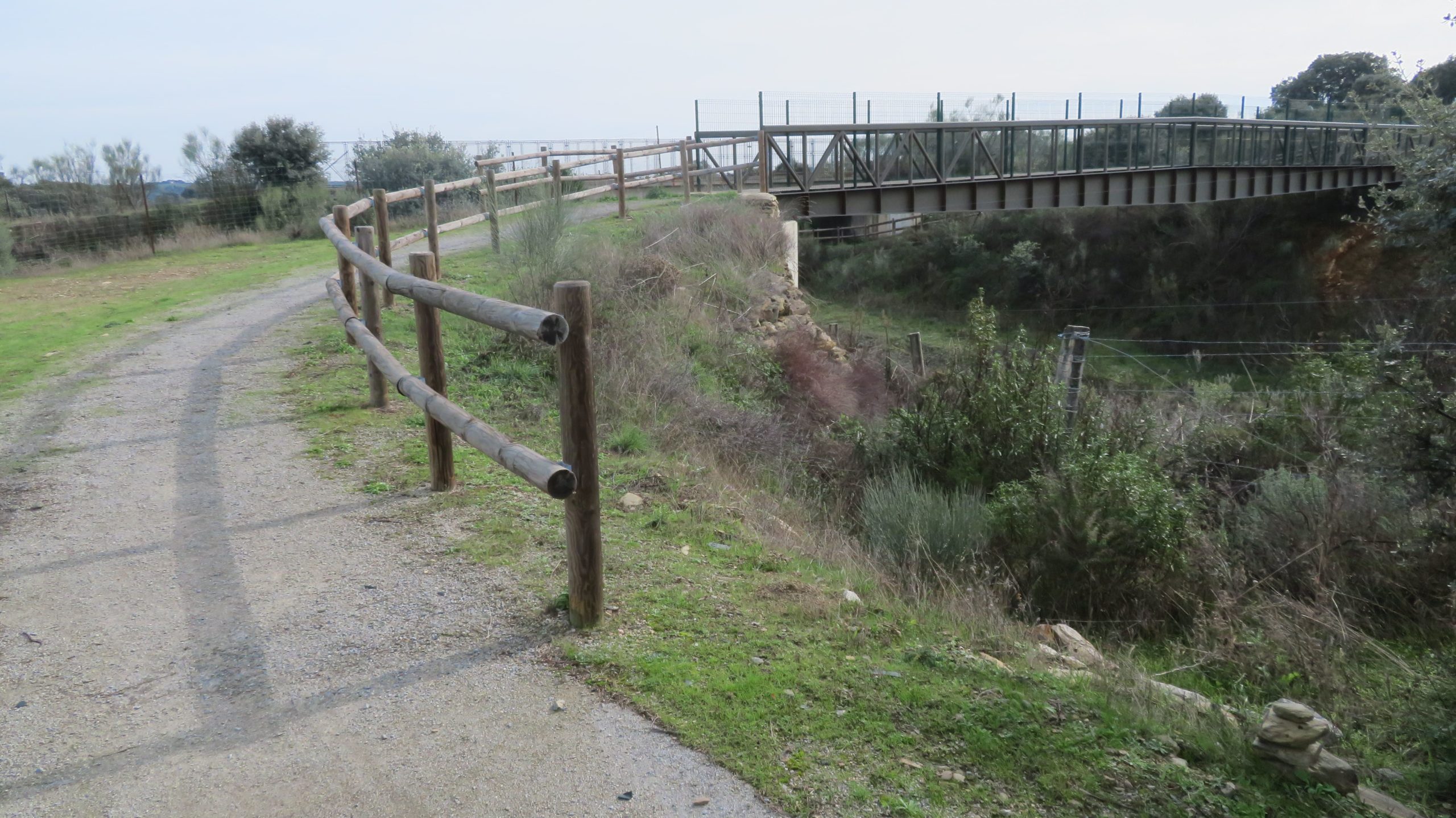 Seguiremos el trazado del antiguo ferrocarril durante 5,5 km. Con suerte coincidiremos con alguno de los trenes que circulan por el vecino trazado. Tras un tramo en ligero descenso pasaremos sobre el Arroyo Tamujoso a través de un puente de madera. Lugar digno de una parada para contemplar estos arroyos que surcan las dehesas. Más adelante cruzaremos sobre la vía férrea actual por un puente, con cuidado con los giros antes y después. Continuaremos otro kilómetro por la Vía Verde y tras cruzar por otra pasarela de madera el Arroyo Calzones, otro de los emblemas del Parque Nacional y su entorno, dejaremos la Vía Verde antes de la siguiente pasarela de madera, bajo la cual hemos de continuar de vuelta hacia Malpartida de Plasencia por la tranquila carretera CC229. Si aún tenemos energía, en este punto podemos continuar 300 m por la Vía Verde para ver las escasas ruinas de la Antigua Estación y volver al mismo punto. Aún se observan restos del embarcadero de animales.